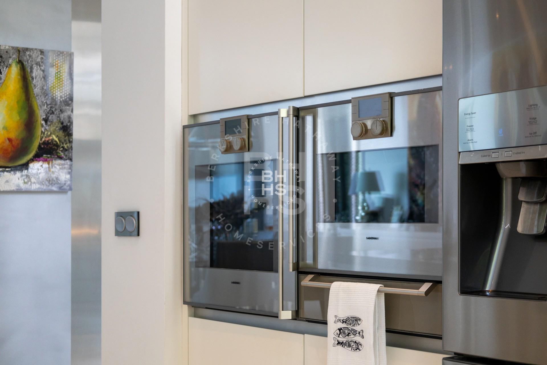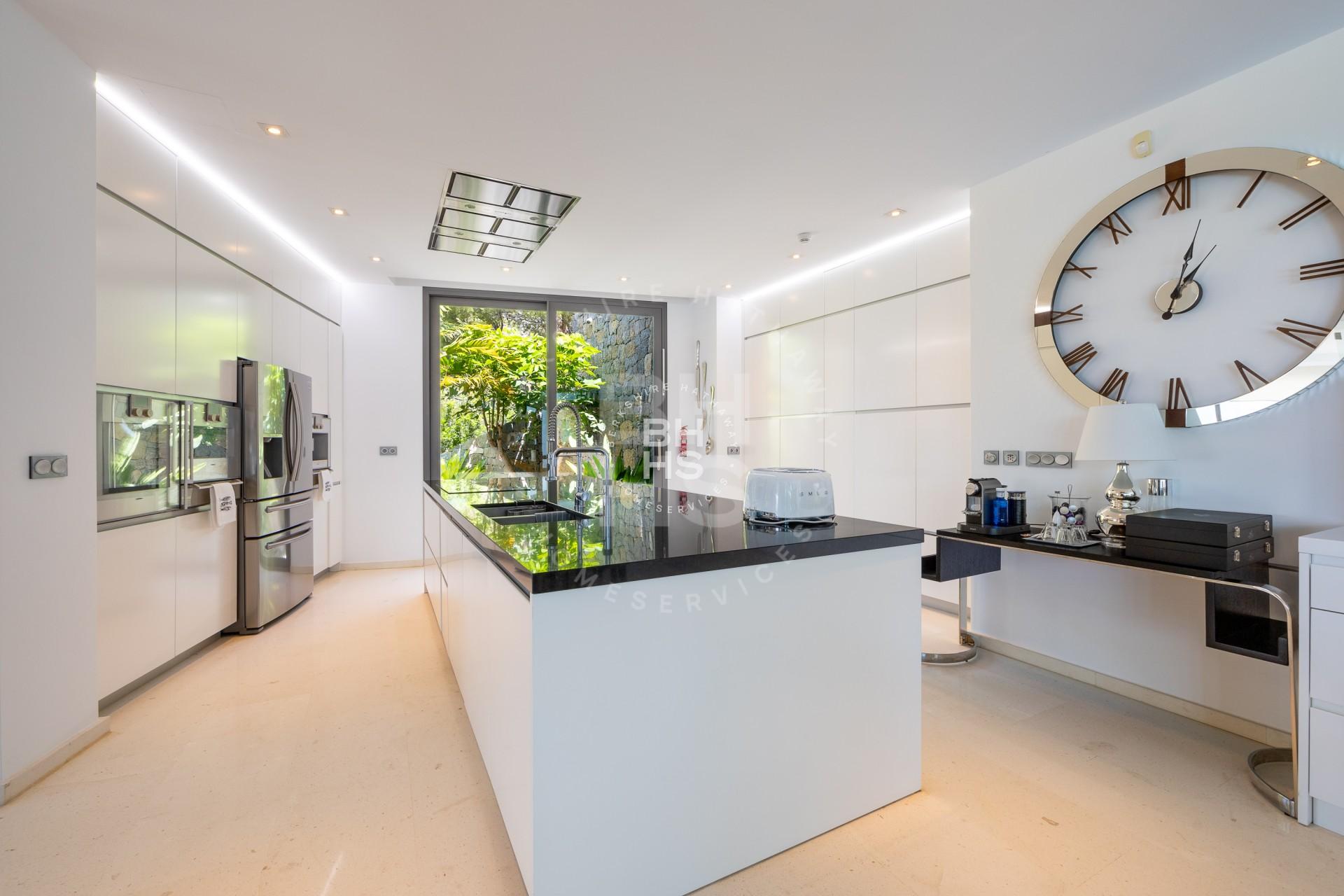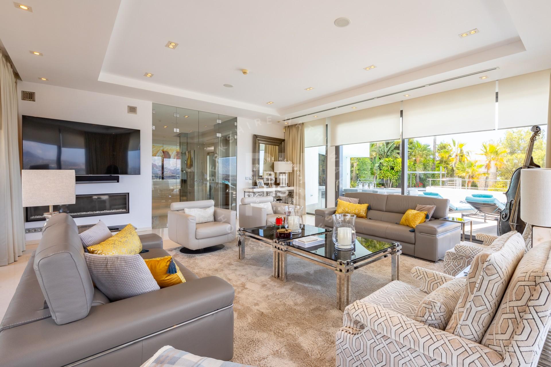 The main living area can be accessed via a stylish glass elevator or from the open terrace, creating a harmonious connection between indoor and outdoor spaces. The living room, with its modern yet elegant design, flows effortlessly into the open but discreet kitchen. Equipped with top-of-the-line Gaggenau appliances, an expansive work island, and panoramic views, the kitchen is a chef’s dream.