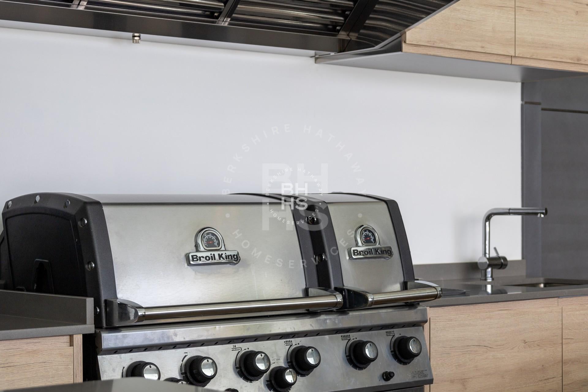A wine cellar with refrigerators and a Hoshizaki ice machine, located behind the outdoor kitchen, and a temperature-controlled wine cellar ensure that every aspect of luxury living is covered.