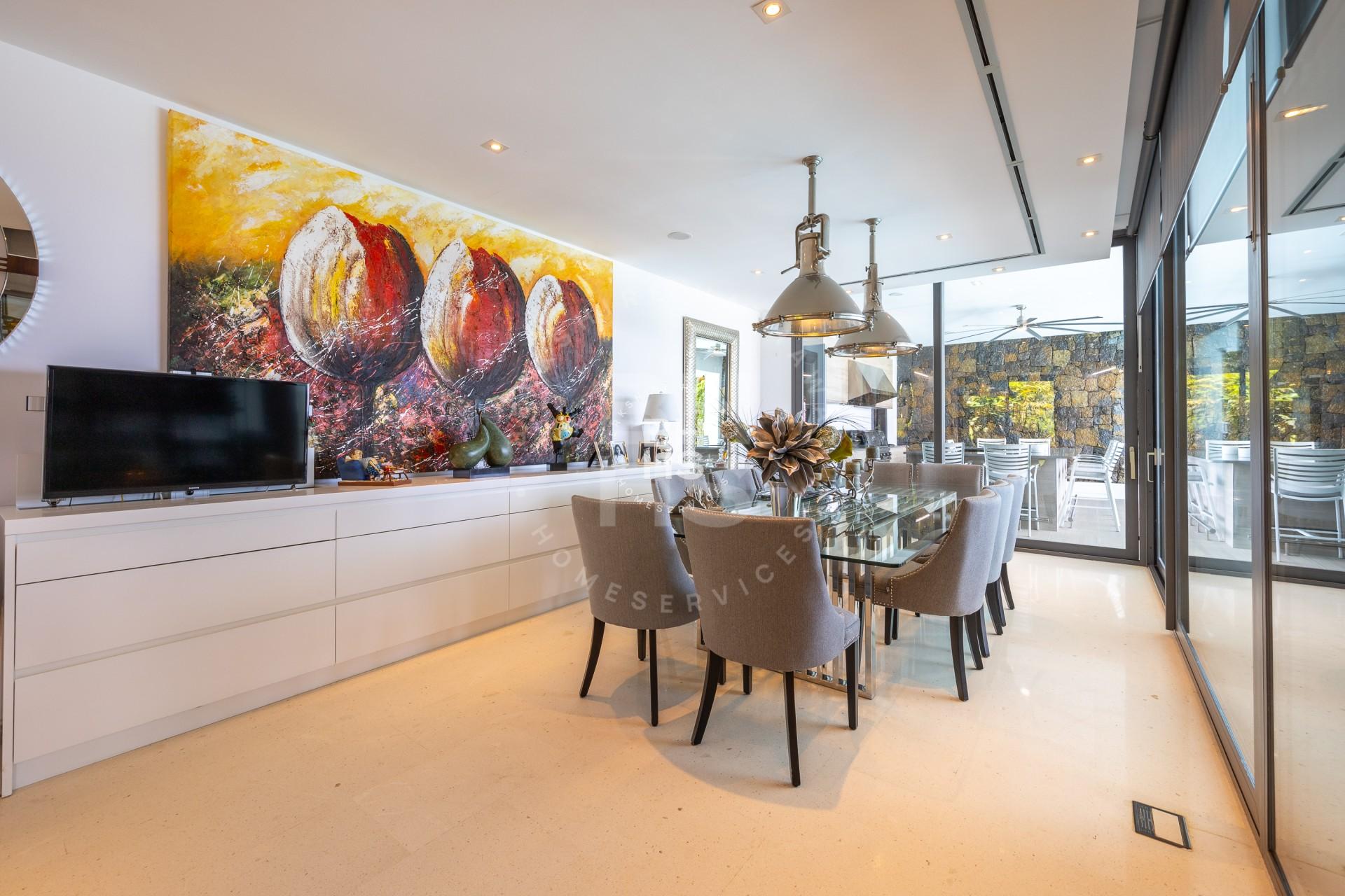 A separate guest suite, complete with a small kitchen area, offers a comfortable and luxurious space for visitors or house staff. Moving to the sleeping quarters, you’ll find two large bedrooms, each featuring built-in wardrobes, en-suite bathrooms, and spectacular views.