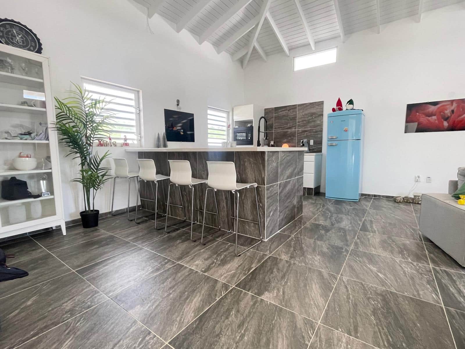 Next to it is the living room (27 m²), which connects smoothly to the terrace through sliding doors. The terrace features an L-shaped pool (8 x 3.5 meters + 6 x 3.5 meters). A staircase leads to the rooftop terrace, offering stunning views of the Caribbean Sea and the beautiful island of Bonaire. Part of the roof is equipped with 15 solar panels. Additionally, a beautiful apartment is located on the property, and there is still plenty of space left for parking multiple cars.